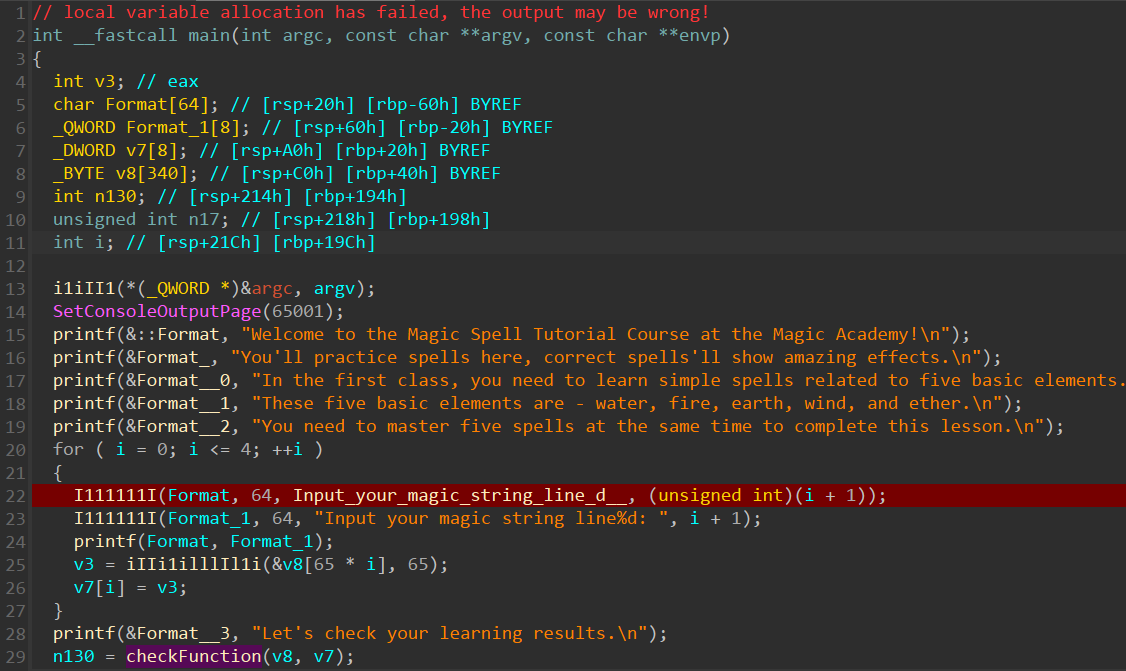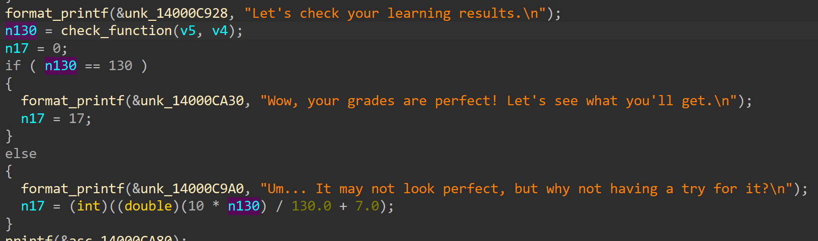 接下来就是校验输入,v4从上下文可以知道是输入字符串的长度,也是一个数组。校验函数的返回值为130才能判断为正确