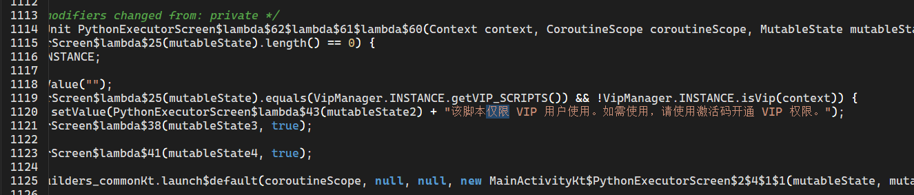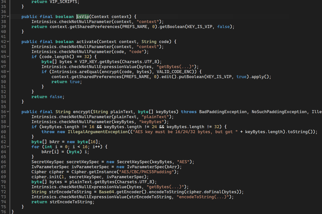 apk放入jdax进行分析,ktolin编写的。放入虚拟机可知,我们需要输入一个注册码,这个注册码可能是我们要求的flag。我们搜索字符串可以发现相关的代码,下面有个isVip