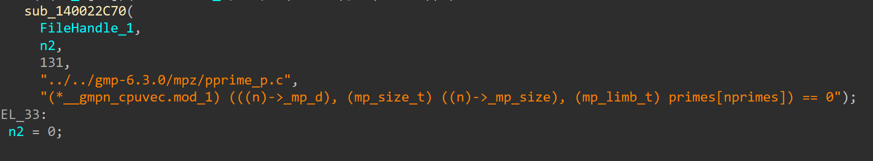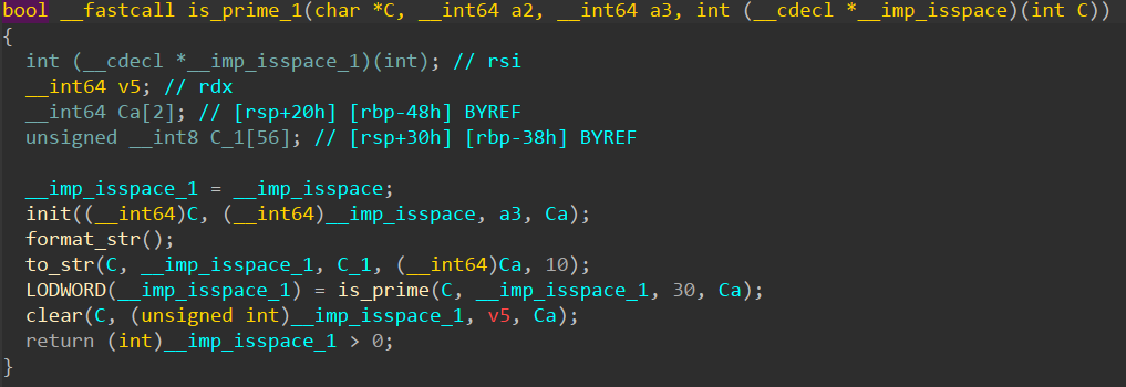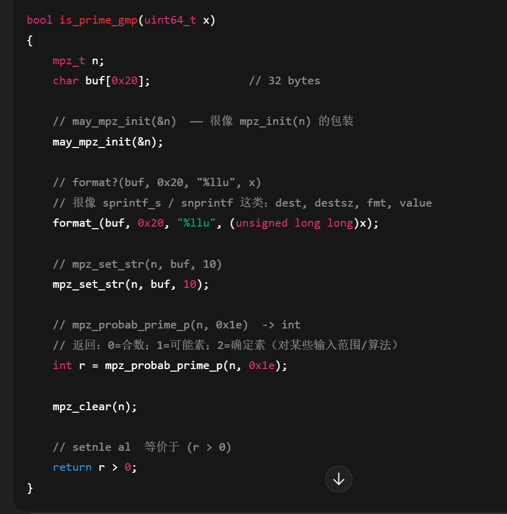 这个函数其实只有一个参数,IDA抽风搞出那么多,不过我不太理解的是为什么要先把数字转换为字符串,再转为mpz_t,再来判断质数,转换字符串这个步骤我感觉可以去掉(混淆另说)