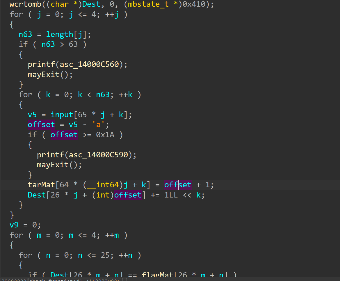 check_function的逻辑比较简单,将输入的字符串挨个字符处理,每个字符转换为与’a’的相对差,然后在定位到Dest二维数组中,每出现一次就加上2^k。最后Dest数组要和flagMat数组进行以一比对,相同才正确。这个tarMat数组没有仔细研究,根据后面的显示效果来看,应该是跟最后显示flag有关。