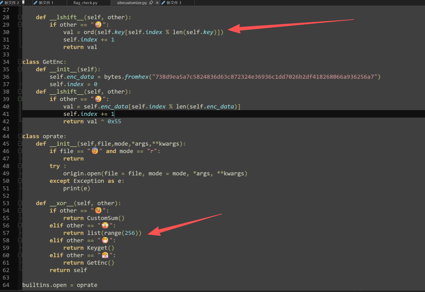 但是这个程序还有一个页面,用来执行python程序,并且flag_check代码需要vip执行,我们阅读这个文件的源码,发现是非常奇怪的代码,还有emoji,可以联想到对open和符号运算符函数进行了重载。我们可以MT管理器定位到flag_check.py,同级目录下还有一个文件,这个文件内部就是对上述的函数进行了重载。