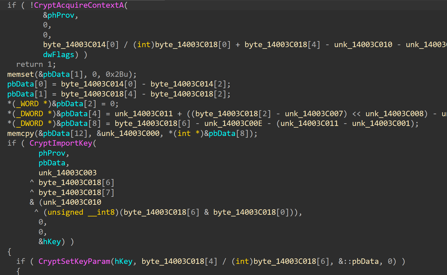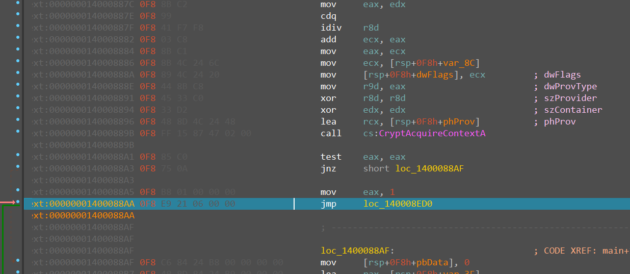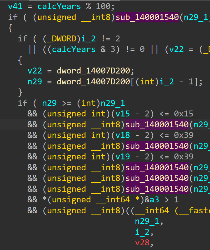 此外,我也分析了解密函数,因为分析时间判断函数我曾一度陷入死胡同,我就想能否通过破解解密函数来获取flag,但是并未深入,这个函数的比较复杂。我尝试过在x64dbg里面GetSystemTimeAsFileTime修改的时间写死,不过屏幕显示出来的字节码还是变化的,这个就超乎我的预料的,解密函数是比较复杂的,我猜测可能是不符和条件的就会随机生成字符