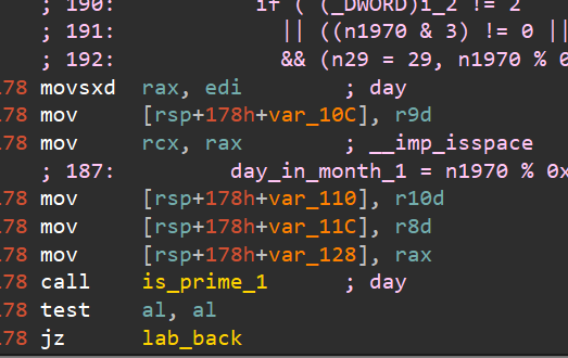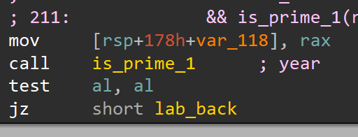 可读性增加了很多。经过我的动调测试,这个确实是测试输入的整数是否为质数is_prime_1。接下来我们继续动调,观察执行的流程。由于IDA显示的伪代码并不正确,太过于有误导性,因此我们看汇编,观察传入函数is_prime_1的参数值rcx。经过了漫长的调试,我分析出了这些: