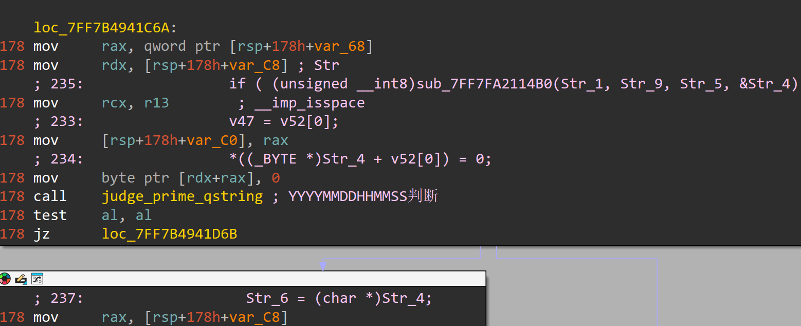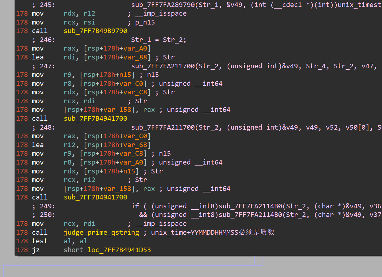 这个是判断unix_time+YYYYMMDDHHMMSS 是要为质数,不过我在动调的时候就发现,还有一个寄存器里面的字符串是YYYYMMDDHHMMSS+unix_time的,这个在后面进行判断了