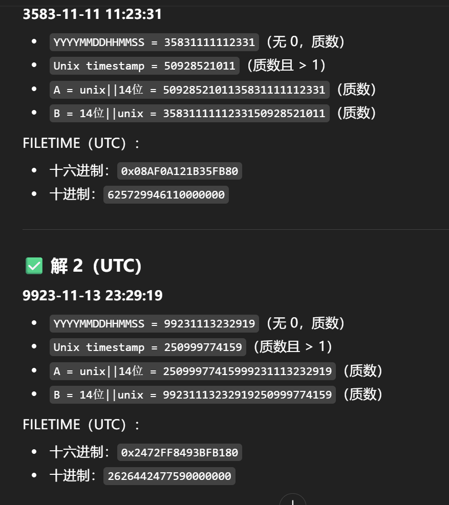 - str(unix_timestamp) + str(YYYYMMDDHHMMSS) 与 str(YYYYMMDDHHMMSS)str+(unix_timestamp)也是质数