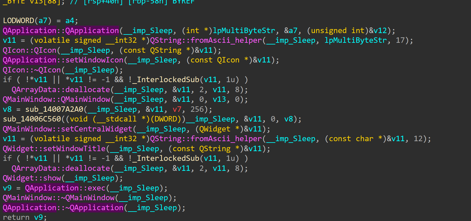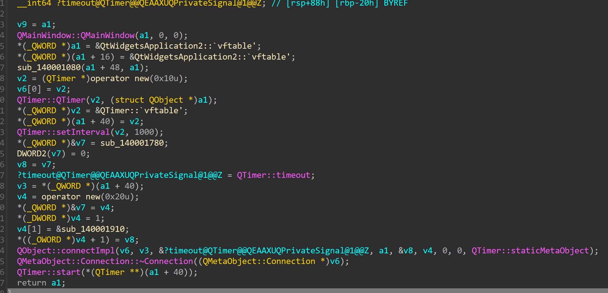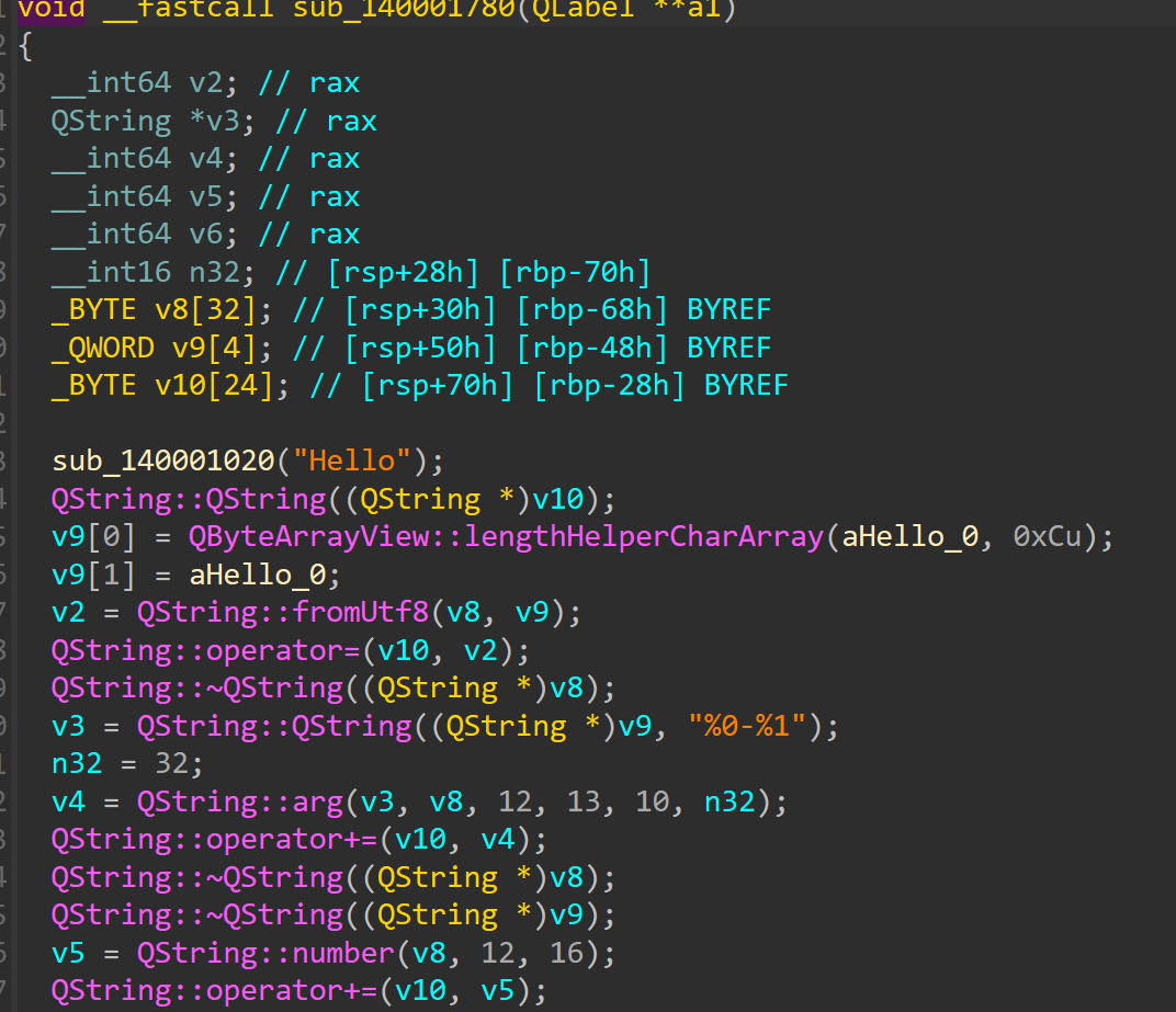 这个函数可以确定是Qt项目中的main函数。为了方便分析Qt的各种特性,可以写一个Qt程序进行对照分析。