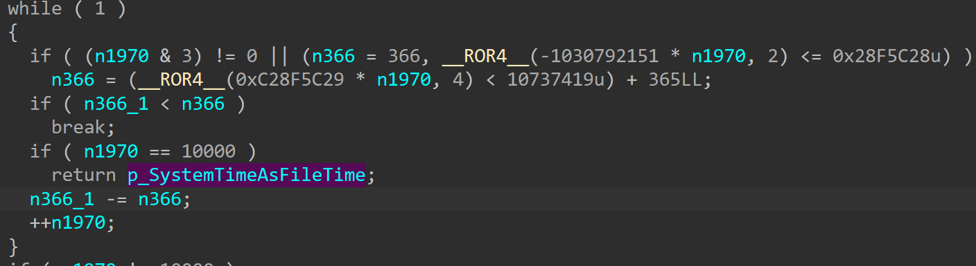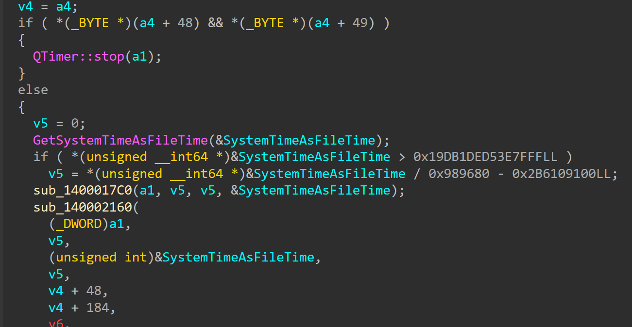 槽函数也许有混淆或者被优化了,IDA的伪代码有很多的错误,槽函数的参数数量最多只有this指针。这里我们可以发现获取了系统时间,并且时间格式是FILETIME,并且还做了一些神秘的转换。把转换的代码贴入浏览器: