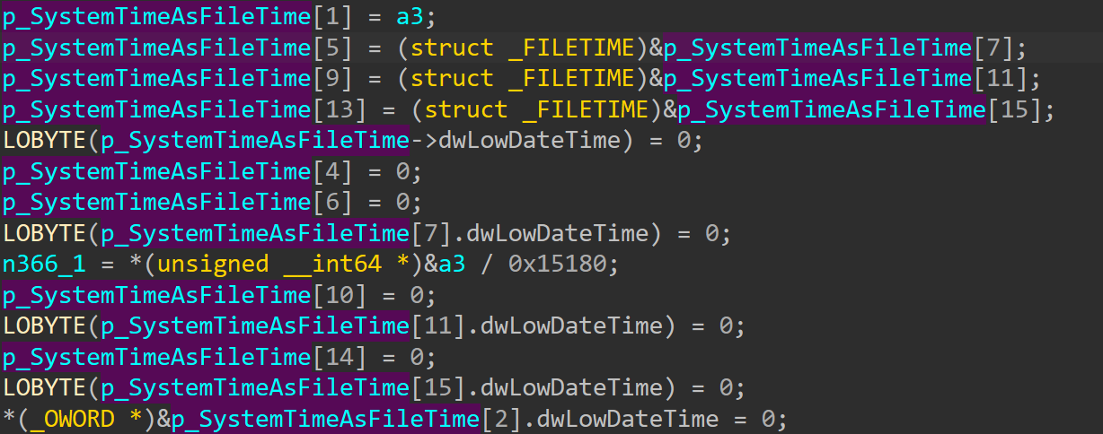 接下来是sub_1400017C0函数,第一眼就可以看见对FILETIME结构体赋值,很明显,IDA推导的结构体类型并不正确,原来的结构体大小要更大。