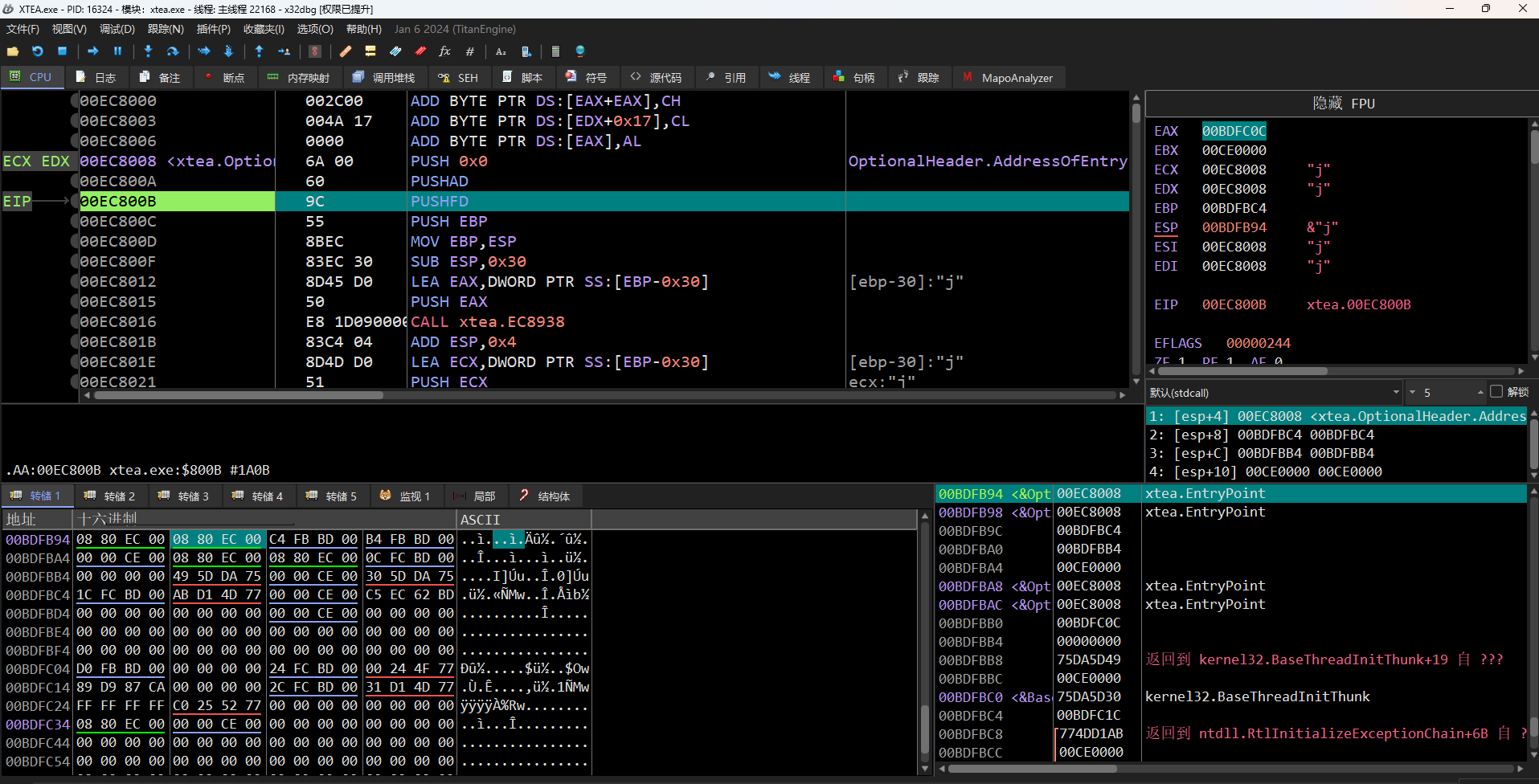 切换到调试器,可以发现在程序入口处又PUSHAD和PUSHFD保存目前的寄存器,脱壳完成后就会还原寄存器,我们就往栈那边下一个访问断点