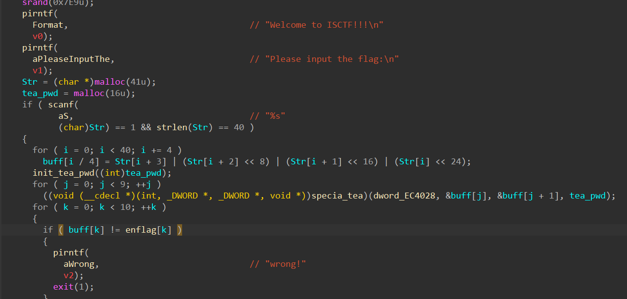 for(int i=8;i>=0;--i) tea_decrypt(&enflag[i], &enflag[i+1], (uint32*)tea_pwd); char buff[40] = {0};