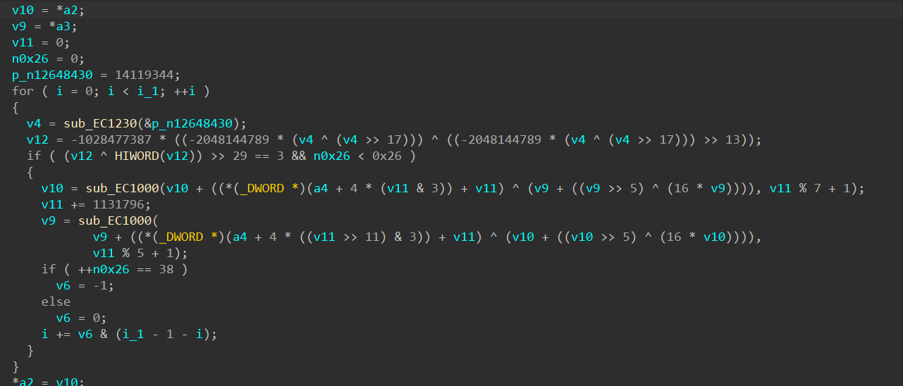 逻辑很清晰,核心就是一个tea的加密,这个我们查看这个tea加密函数,可以发现是被混淆了的