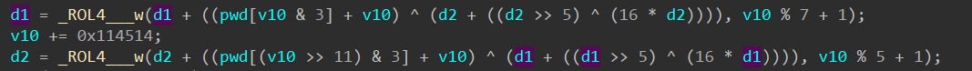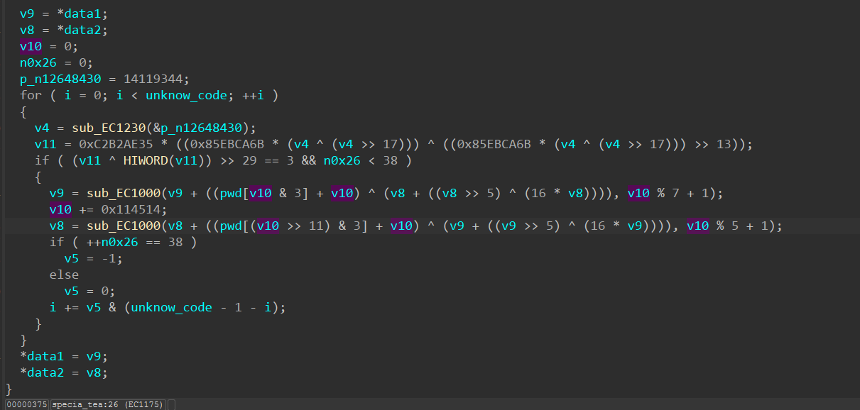 for (i = 0; i < 4; ++i) *(_DWORD*)(tea_pwd + 4 * i) = rand(); } #define C 0x114514u #define ROUNDS 0x26u