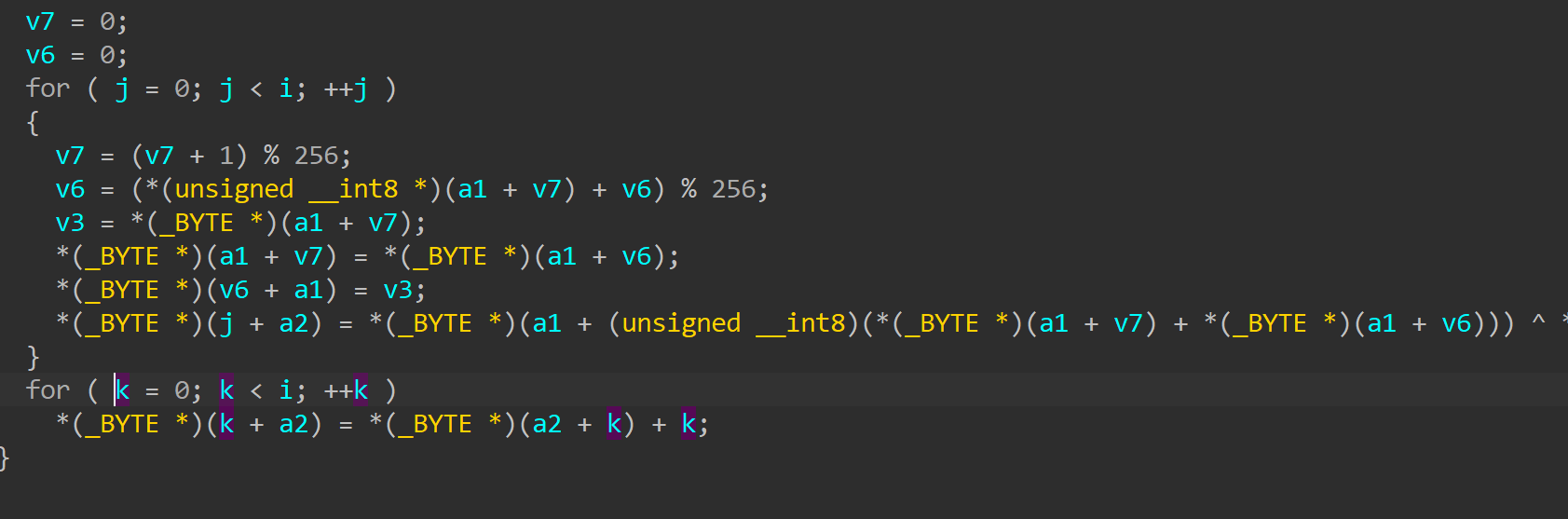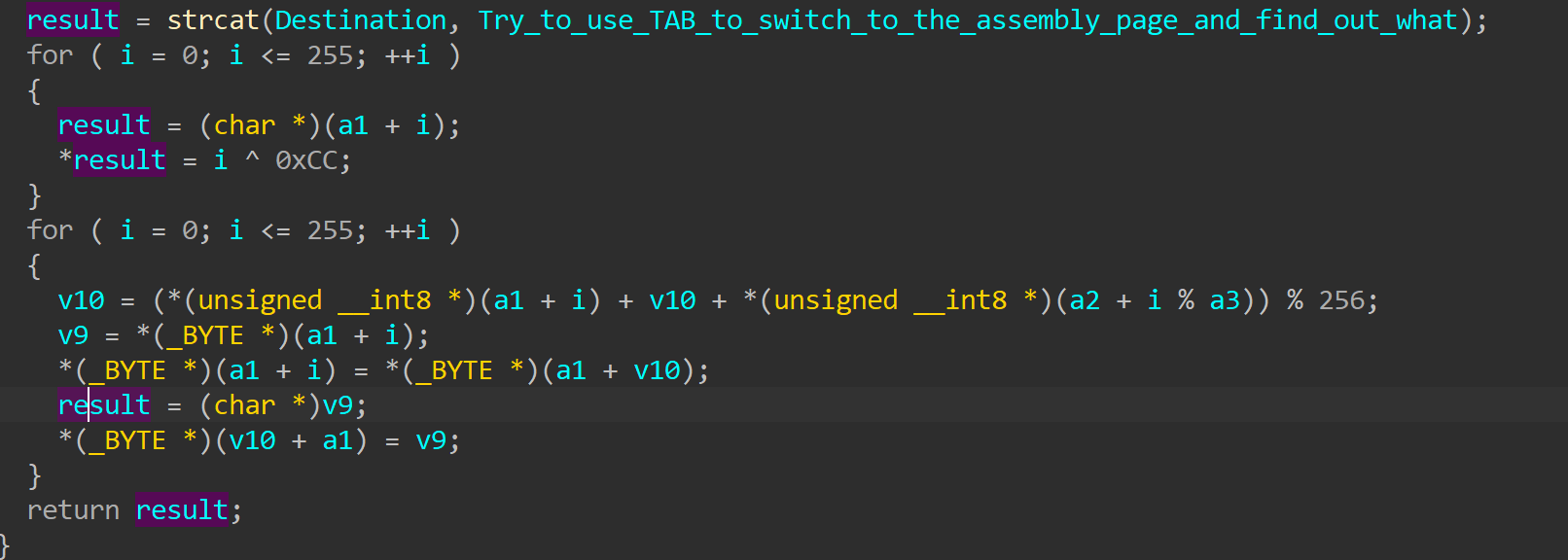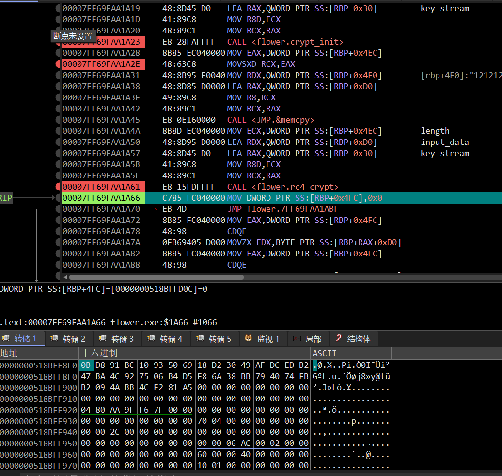查看代码逻辑可以知道,输入flag,进行rc4加密后与v5进行比较,那么反过来,v5就是flag加密后的数据。