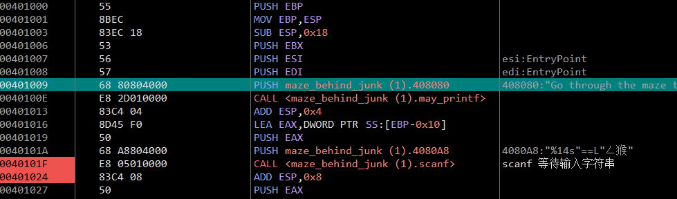 这里很容易看出,push ebp 就是一个函数入口函数,毕竟这个是x86的程序,高亮的那一行就是参数入栈,那么自然下面一句就是printf之类的函数