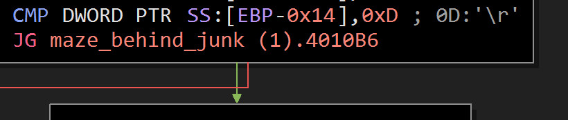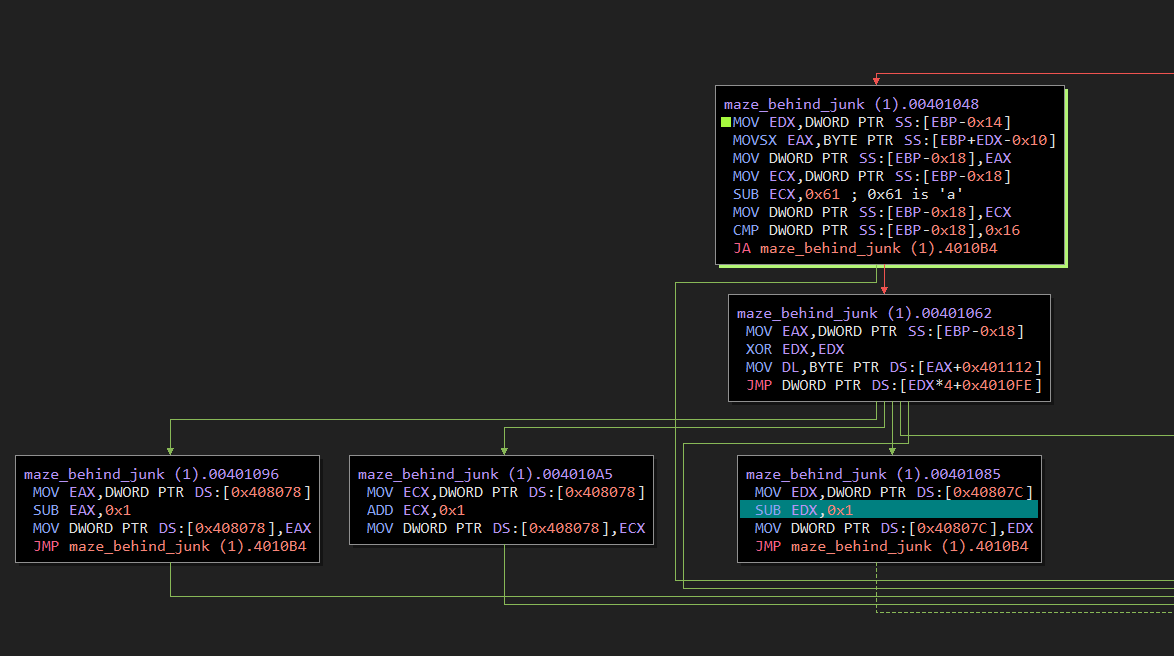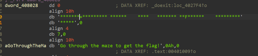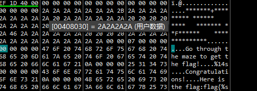 高亮的那一行被许多分支指向,然后自己又回到了上面,可以判断是一个循环,然后我们再看下面就有了 “Congratulation”的字样,说明上面就是flag的判断,这道题是迷宫题,我们还是需要寻找到迷宫。